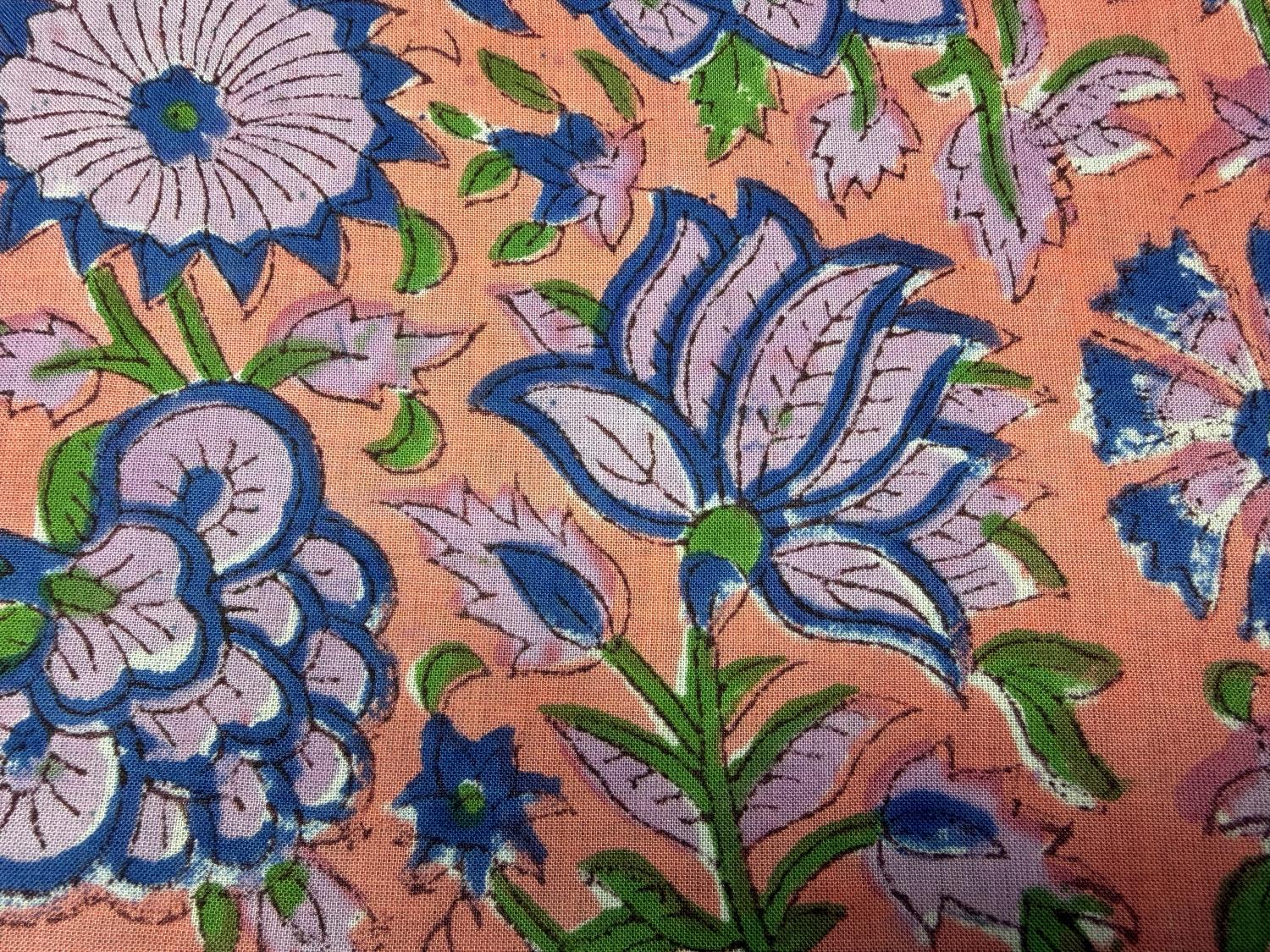 Blokktrykket stoff fra India. Mønstret er trykket for hånd av Anouska sine dyktige håndverkere. Dette er en tidkrevende prosess som begynner med at mønsteretskjæres ut for hånd på treblokkene. Antall treblokker brukt avhenger av antall farger i et mønster, f.eks 3 farger = tre ulike treblokker. Selve trykkingen utføres i perioder av året når solen skinner. Da blir fargene klare og fine.