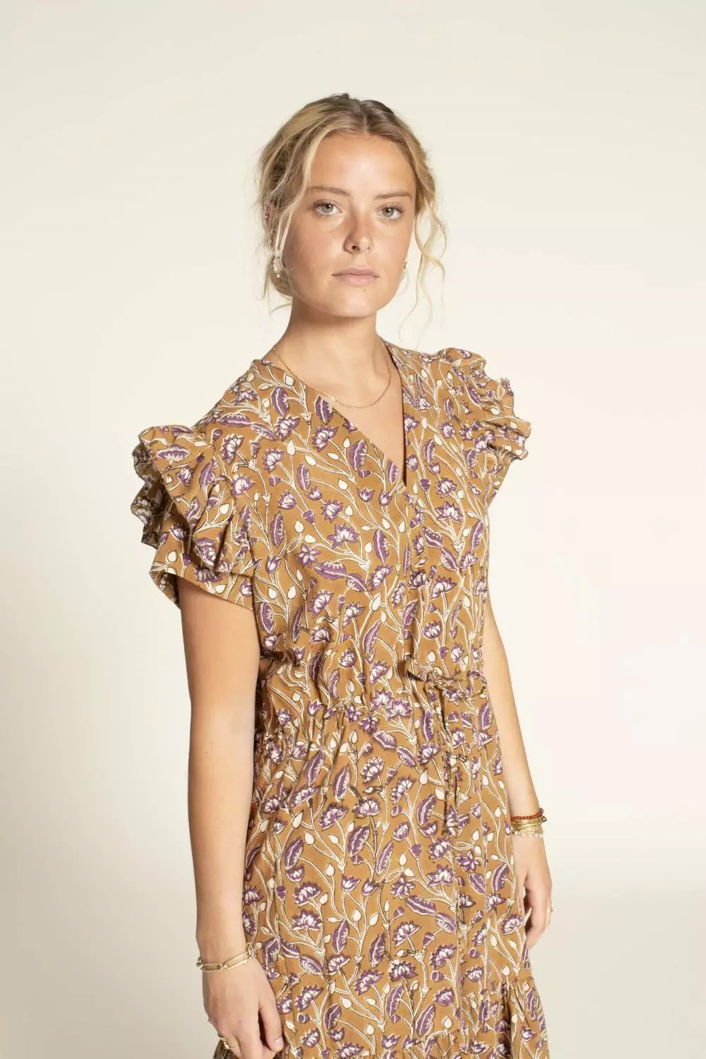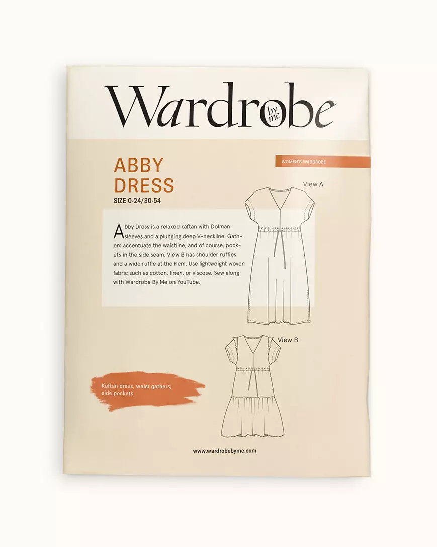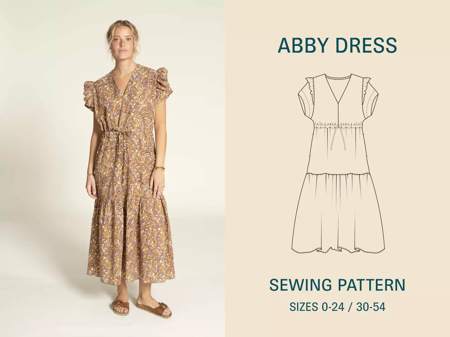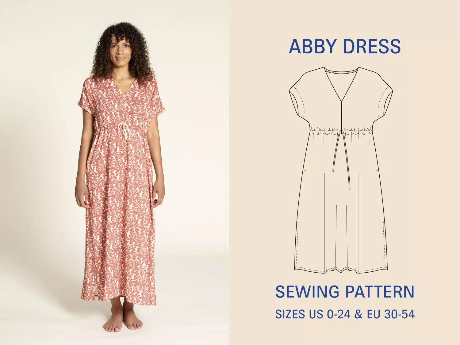 Abby Dress er en avslappet og elegant kaftan-kjole med V-hals og dolman-ermer. Mønsteret har en løpegang i midjen som kan strammes med bånd eller elastikk for en justerbar passform. Praktiske sidelommer og splitt gir både funksjon og stil. Variant B har volanger ved skruldrene og en bred kappe nederst.