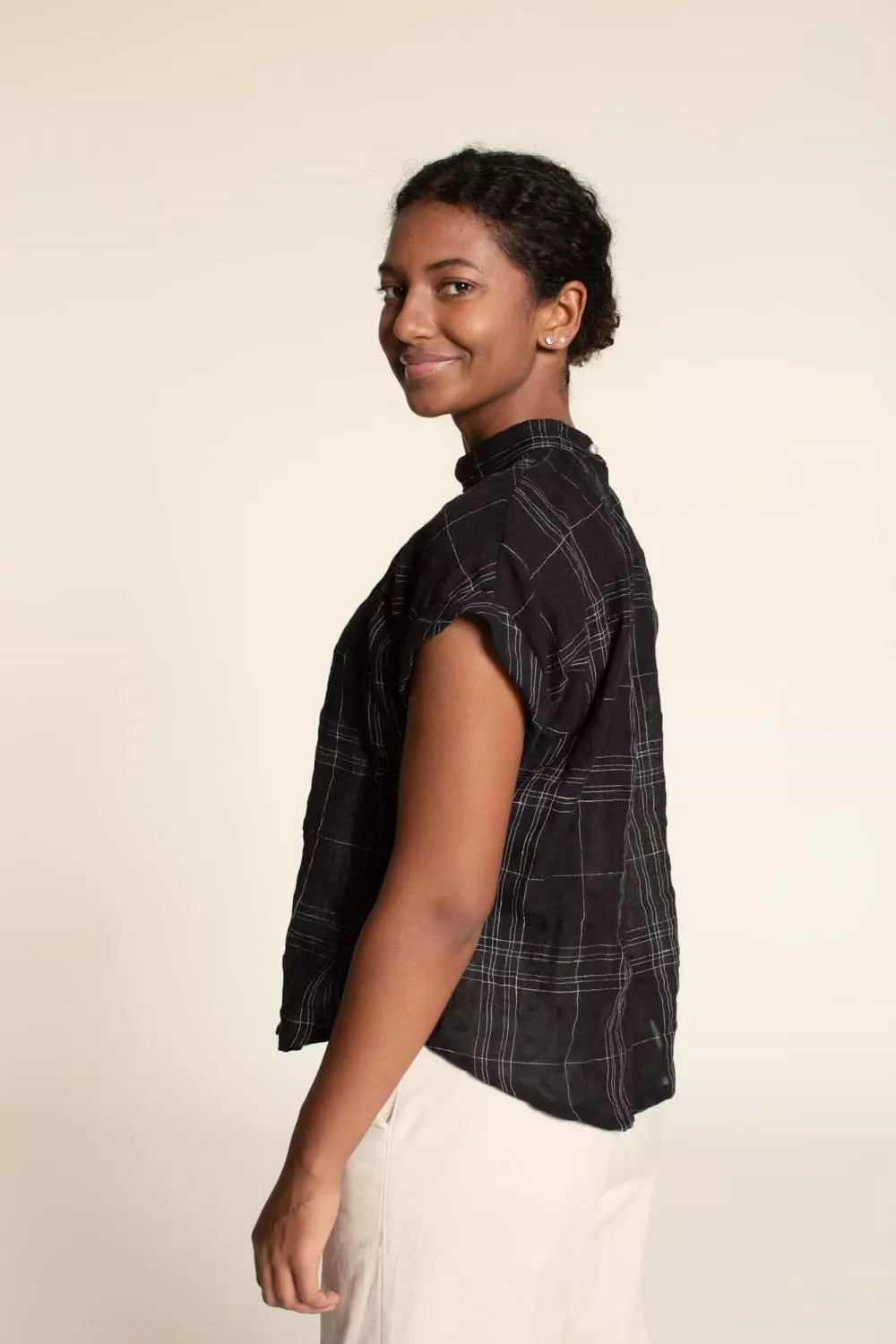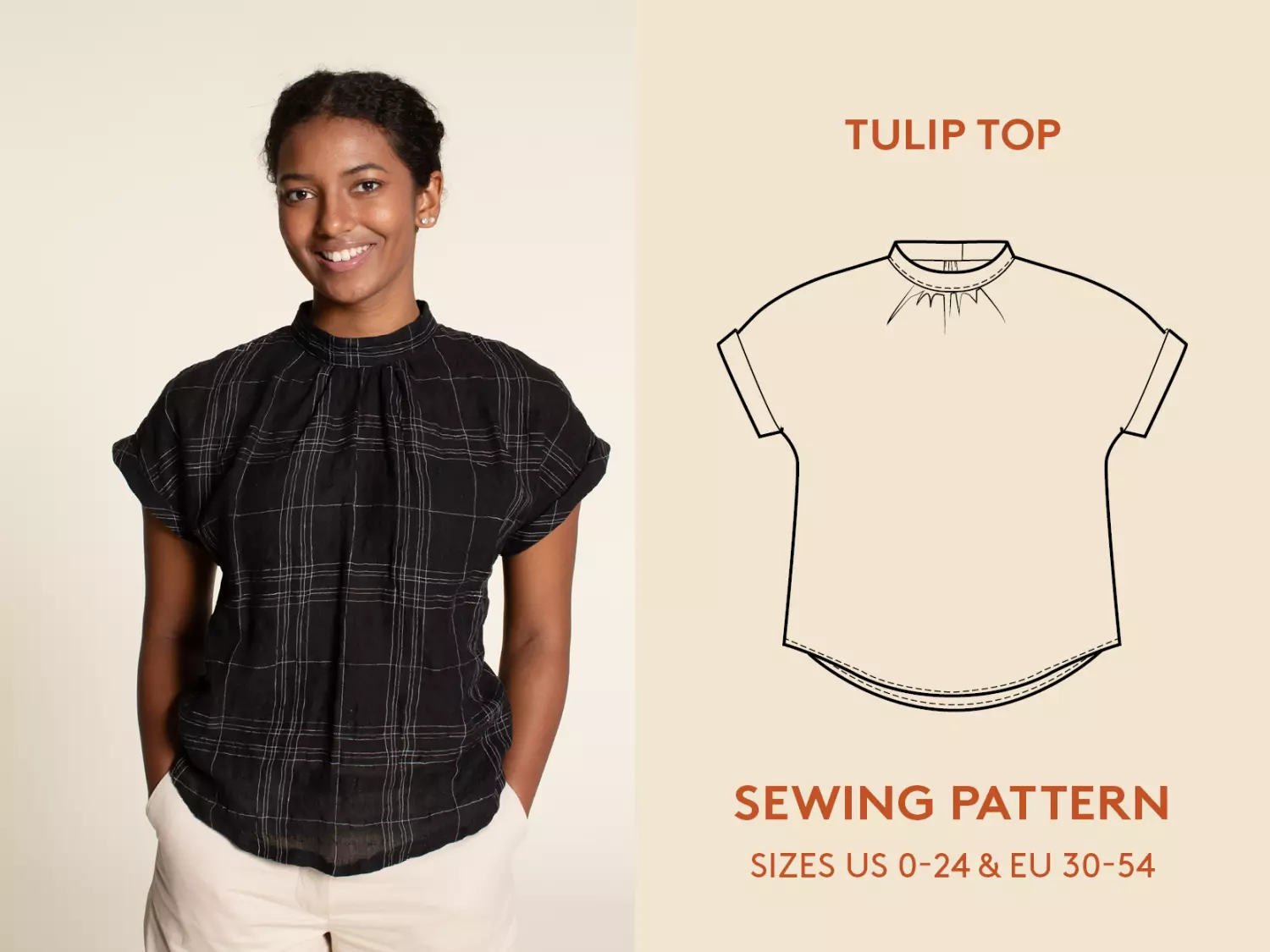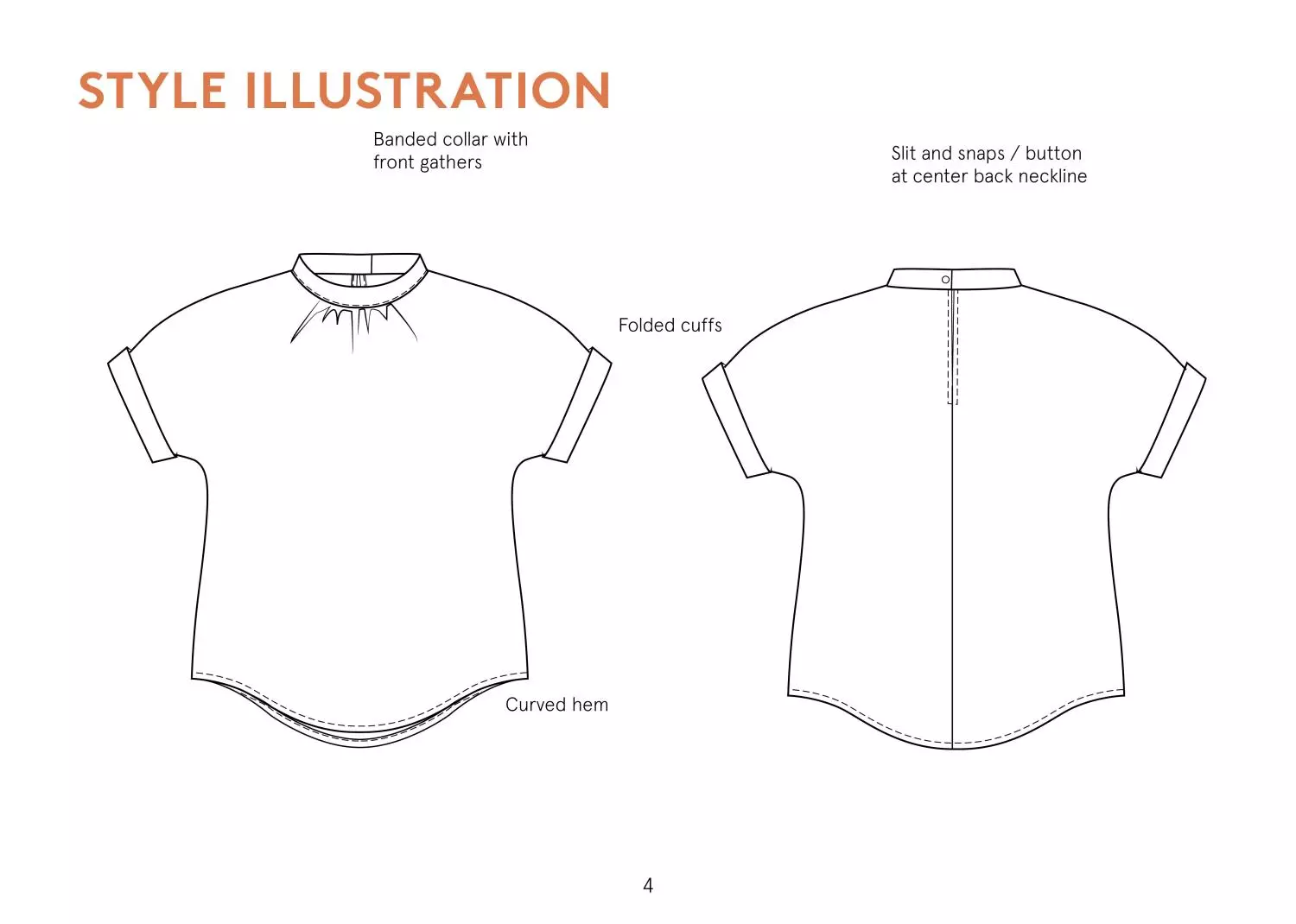 Beautiful gathered neckline top with dropped shoulders and short cuffed sleeves. Features front gathering to collar, curved hemline, and back button closure with slit. Classic feminine design for lightweight woven fabrics. Includes YouTube sew-along video. Sizes 0-24 / 30-54.